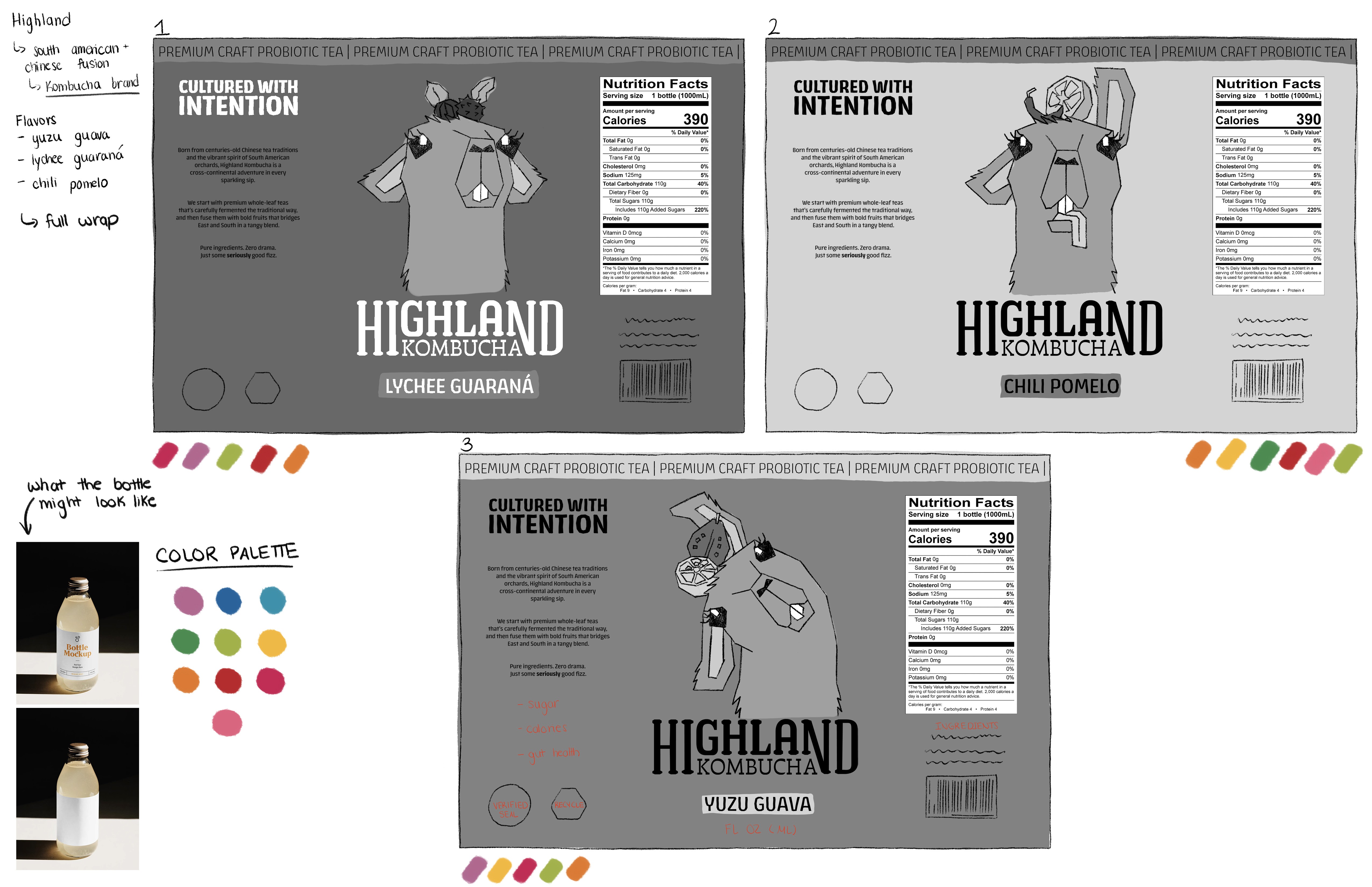 Here, I started to develop what the layout of the full wrap would look like. I created copy for the background story of Highland Kombucha, created a unique wordmark, and researched all the essentials needed on a kombucha label. After a value study, I explored a color palette that would reflect the brand's story well.